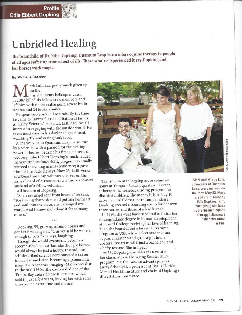 A chance visit to Quantum Leap Farm, run by a scientist with a passion for the healing power of horses, became his first step toward recovery. Edie Ebbert Dopking’s much-lauded therapeutic horseback riding program eventually restored the young man’s confidence; it gave him his life back, he says. Now 29, Lalli works as a Quantum Leap volunteer, serves on the farm’s board of directors, and is the brand-new husband of a fellow volunteer.