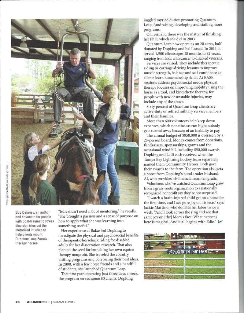 Her experience at Bakas led Dopking to investigate the physical and psychosocial benefits of therapeutic horseback riding for disabled adults for her dissertation research. That also planted the seed for launching her own equine therapy nonprofit. She traveled the country visiting programs and borrowing their best ideas.