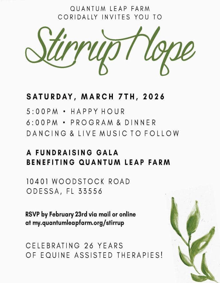 Stirrup Hope is the annual fundraising gala for Quantum Leap Farm’s equine-assisted therapy programs. This year’s event will take place on Saturday, March 7th under a glowing Florida sunset. We expect 400 guests in Quantum’s riding arena again this year!